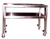 Table top 12 gauge stainless steel sheet, storage shelf 12 ga SS sheet, frame 3.81cm x 3.81cm x 3.18mm, (1 1/2" x 1 1/2" x 1/8") SS square tube, c/w two 7.62cm, (3") dia. Swivel caster and two rigid casters.