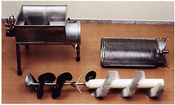 Designed with safety, productivity, ease of operation, and minimal broken product (wastage) in mind. Extra declumping bars in initial pipe for better declumping before the mussels reach the gate, therefore a much better flow of mussels is obtained into the grader, resulting in higher production. The last of the declumping knives on the shaft is adjustable which allows for more flexibility while declumping the mussels just before they reach the grading duums, resulting in a near-elimination of crushed shells, therefore a near 100% yield is obtained. (Many other mussel declumper/graders yield a high percentage of broken-shell mussels, much of the breakage occurring during final declumping and entry into the grading drum.)