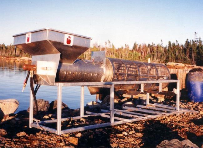Mussels are dumped into the hopper. The rotation of the drums moves the mussels/mussel seed through the drums where they are sorted into select size categories.