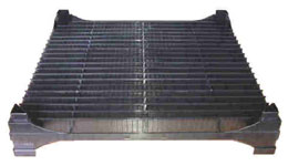Entirely of plastic, a square frame with 20 cross-pieces to which the spat adhere. Each cross-piece is at an angle of approximately 30 degrees from vertical, is 5.5cm, (2") high, and has numerous ridges to help spat collection.