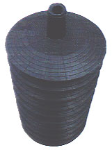 Stacks of plastic discs 157mm in diameter, with 'necks' which enable stacking of the discs. The necks abut one another to keep spacing for spat to develop. The discs have raised ridges which help the spat adhere to them. Each stack is 1.2m high, with a PVC tube inserted in through the hats and melted on each end to hold them together.